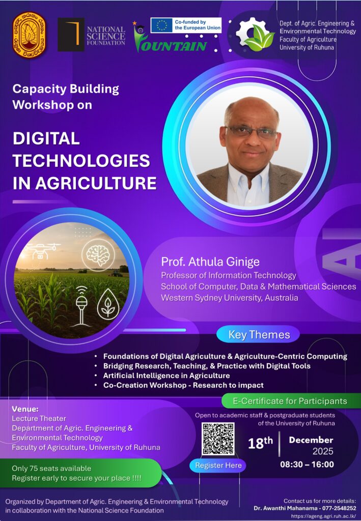 We are excited to invite academic staff and postgraduate students of the University of Ruhuna to an inspiring one-day workshop on Digital Technologies in Agriculture, organized by the Department of Agricultural Engineering & Environmental Technology in collaboration with the National Science Foundation.